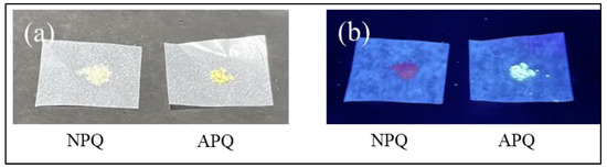 Photographs of NPQ in the solid state under (a) natural light and (b) UV irradiation with a handy UV lamp (λex = 365 nm).