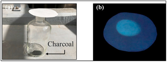 Finally, the prepared test paper was applied to detect CO generated from the combustion of charcoal. As a result, fluorescence was observed in the area on the test paper exposed to charcoal smoke, suggesting that the CO in the smoke came into contact with NPQ adsorbed on the test paper, resulting in the fluorescence turn-on of the test paper (Figure 14). In previous reports, most fluorescent probes have used tricarbonyl dichloro ruthenium (II) dimer (CORM-2) or CORM-3 as CO-releasing agents and have not been applied to the detection of CO gas produced by combustion of organic materials [21,51,52]. On the other hand, the proposed NPQ was able to detect CO directly in charcoal smoke; the NPQ test paper has the potential for applications such as being useful for on-site monitoring of CO to alert acute CO poisoning.