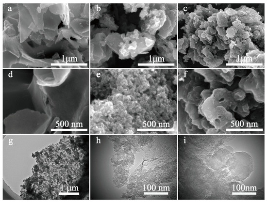 Scanning electron microscopy (SEM) and transmission electron microscopy (TEM) were used to observe the morphology and microstructure. As seen in Figure 2a,d, Mi-CPC exhibits a sheet-like structure. In contrast, Me-CPC shows an irregular three-dimensional (3D) hierarchical structure in Figure 2c,f, mainly due to persistent gas release through pyrolysis of the g-C3N4 template. Different from the single template, dual templates of g-C3N4 and potassium citrate can endow different morphologies to the products. As shown in Figure 2b,e, the morphology of h-CPC with both nanosheet and 3D hierarchical structure, which is the combined action of potassium citrate and g-C3N4. As seen in the TEM images of h-CPC (Figure 2g–i), the carbon layer and the nanopores distributed in it can be clearly seen.