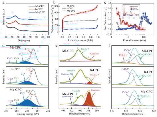 (a) XRD, (b) N2 desorption/adsorption isotherms, and (c) pore size distributions of Mi-CPC, h-CPC, and Me-CPC. High-resolution spectra: (d) C 1s, (e) N 1s, and (f) O 1s.
