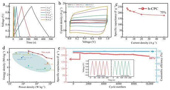 A specific capacitance of 240 F g−1 was achieved at 1 A g−1 and 180 F g−1 at 50 A g−1 with a capacitance retention rate of 75% (Figure 5c). The maximum energy density of the device was calculated to be 8.3 Wh kg−1 at 250 W kg−1 and still reached 6.6 Wh kg−1 at 12,500 W kg−1 (Figure 5d), which is significantly better than the carbonaceous material already reported. The assembled devices also exhibited 100% Coulomb efficiency and 88% capacitance retention after 10,000 cycles (Figure 5e), respectively. As can be seen from Figure 5e, after 10,000 cycles, the GCD changes minimally and demonstrates high reversibility and cycling stability of the h-CPC electrode. To extend the application of h-CPC-based supercapacitors, we assembled supercapacitors with two electrodes at 1 M Na2SO4. The h-CPC is capable of operating at a high voltage of 1.6 V and exhibits remarkable capacitance, rate performance, and cycling stability (Figure S4).