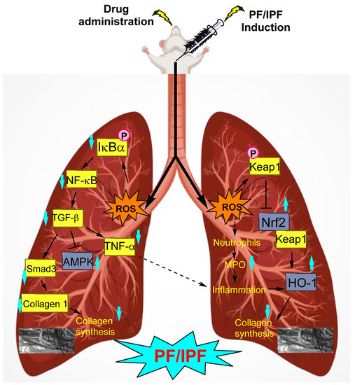 ALT (alanine transaminase), AST (aspartate aminotransferase), ATI (alveolar epithelial type I), Bcl-2 (B-cell leukemia/lymphoma protein), BALF (bronchoalveolar lavage fluid), COPD (chronic obstructive pulmonary disease), CS (cigarette smoke/smoking), COL1A1 (collagen type-1 alpha-1), CTGF (connective tissue growth factor), CK (creatine kinase), COX-2 (cyclooxygenase-2), EMT (epithelial–mesenchymal transition), ECM (extracellular matrix), ERK (extracellular signal-regulated kinase), FGF (fibroblast growth factor), FSP-1 (fibroblast-specific protein-1), FN (fibronectin), GSH (glutathione), HO (heme oxygenase), HBV (hepatitis B virus), HMGA2 (high-mobility group AT-hook 2), HIF-1α (hypoxia-inducible factor 1-alpha), HBEs (human bronchial epithelial cells), HLF (human lung fibroblast), IPF (idiopathic pulmonary fibrosis), IHC (immunohistochemistry), iNOS (inducible nitric oxide synthase), IGF-1 (insulin-like growth factor-1), IFN-γ (interferon gamma), IL (interleukin), ICAM (intracellular adhesion molecule), JNK (c-Jun N-terminal kinase), LDH (lactose dehydrogenase), LC3I (microtubule-associated protein light chain 3), LPS (liposaccharide), MDA (malondialdehyde), MMP (matrix metalloproteinase), MRC (medical research council), MCP-1 (monocyte chemoattractant protein-1), MLg (mouse lung fibroblast line), MUC5AC (mucin 5AC), NOX-4 (NADPH oxidase 4), NIH (National Institutes of Health), NHLF (normal human cell fibroblast), NF (nuclear factor), Nrf-2 (nuclear factor erythroid 2-related factor), NLRP3 (nucleotide-binding leucine-rich pyrin 3), PI3K (phosphoinositide 3-kinase), p-CaMKII (phosphorylated calmodulin-dependent protein kinase II), p-Atk (phosphorylated protein kinase-B), PAI -1 (plasminogen activator inhibitor-1), PGDF (platelet-derived growth factor), PCNA (proliferating cell nuclear antigen), PHD2 (prolyl hydroxylase domain-containing protein 2), PF (pulmonary fibrosis), PLF (pulmonary lung fibroblast), RAB7B (Ras-related protein Rab-7b), ROS (reactive oxygen species), RAGE (receptor for advanced glycation end products), RIPK (receptor-interacting serine/threonine-protein kinase), α-SMA (α-smooth muscle actin), sEH (soluble epoxide hydrolase), SOD (superoxide dismutase), TERC (telomerase RNA component), TAF (tenofovir alafenamide fumarate), TIMP (tissue inhibitor of metalloproteinase), TLR-4 (toll-like receptor protein), TEM (transmission electron microscopy), TGF-β1 (transforming growth factor beta-1), ZEB (zinc finger E-box-binding homeobox 1).