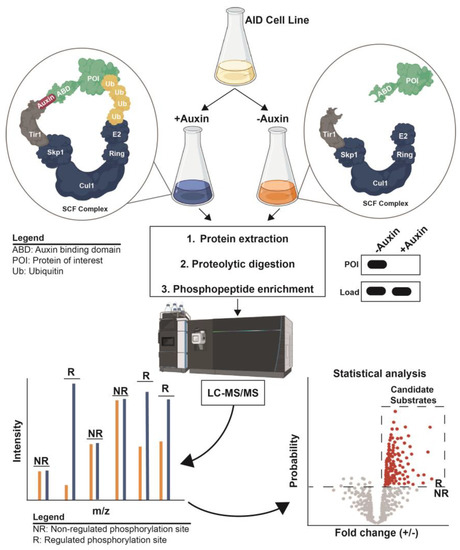 Multiple inducible degradation technologies have been developed, but they all share the fusion of a degron sequence to the target gene of interest that promotes the rapid proteasomal degradation of the fusion protein in response to the addition of a chemical reagent or a change in experimental condition (e.g., temperature or light). These systems are thoroughly reviewed elsewhere [115,116,117,118]. Here, we focus on just the auxin-inducible degradation (AID) system [119], which appears to be the most convenient, commonly used, and widely applicable inducible degradation technology, and a system that research groups are beginning to combine with phosphoproteomics. The AID system, based on the natural function of the plant hormone auxin, requires fusion of the target gene to the coding sequence of a plant auxin-binding domain (ABD) and the expression of a plant Tir1 F-box protein (Figure 4). Auxin acts as a molecular glue that mediates interaction of ABD and Tir1, resulting in the recruitment of ABD to the SCF E3 ubiquitin ligase for polyubiquitylation and proteasomal degradation. In many model organisms, such as S. cerevisiae, near-complete target degradation can be achieved within 10–15 min of auxin addition to liquid cultures [119]. Thus, auxin essentially acts as a universal, highly specific chemical inhibitor for any target of interest. While natural auxin can have off-target physiological effects in some species [120,121,122,123], a newer version of AID called AID2 used the bump-and-hole approach to create mutant Tir1 that responds to extremely low concentrations of a bulky synthetic auxin analog [123,124], greatly reducing the chance of off-target effects. AID and AID2 appear to be applicable in all major eukaryotic clades with the exception of plants, having been established in budding and fission yeasts, Plasmodium falciparum, Drosophila melanogaster, Caenorhabditis elegans, mice, cultured human cells, and others [123,124,125,126,127,128,129].