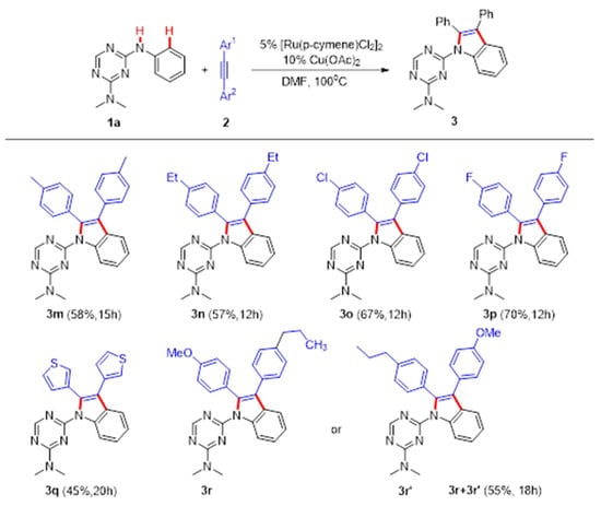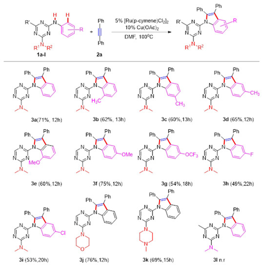 We commenced our studies by identifying the reaction of N2,N2-dimethyl-N4-phenyl-1,3,5-triazine-2,4-diamine (1a) with 1,2-diphenylethyne (2a) in the presence of a ruthenium catalyst. We focused our optimization studies on a variety of additives (Cu(OAc)2, Cu (NO3)2, Cu (NO3)2, CuBr2, Cu(CF3SO3)2, NaOAc, CsOAc); the initial screening indicated that the use of Cu(OAc)2 proved to be optimal and gave a higher yield ( Table 1, entries 1–7). Notably, additional KBF6 to the reaction mixture did not improve the production of the desired product 3a (Table 1, entry 8). However, this reaction could not proceed without (Cu(OAc)2, suggesting that Cu(OAc)2 was vital for this transformation (Table 1, entry 9). Decreasing the loading of Cu(OAc)2 to 5% resulted in a 19% yield, while a slightly lower yield was observed when 20% of Cu(OAc)2 was added (Table 1, entries 10–11). The yield of 3a improved to 63% when the reaction was conducted at 100 oC (Table 1, entries 12–14). To our delight, a comparable yield (71%) was obtained by increasing the number of equivalents of 2a (Table 1, entries 15–17). Moreover, the reaction was conducted for 6 h so that it could lead to a lower yield, with many of the starting materials remaining unreacted (Table 1, entry 18). It is worth noting that the unidentified reaction occurred during the operation at 24 h (Table 1, entry 19). We also investigated a set of representative solvents, and DMF was proven to be the best choice for this synthetic methodology (Table 1, entries 20–23). Furthermore, Pd-catalysts were explored as a catalyst system, but the desired product was hardly observed (Table 1, entries 24–25). However, increasing or decreasing the amount of the ruthenium catalyst (10% or 2%) showed less efficiency for the formation of 3a (Table 1, entries 26–27).