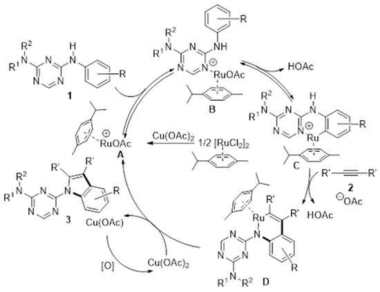 Based on the previous work [40,41,42,43], we inferred the possible mechanism for ruthenium oxidative annulation approaches. Firstly, cationic ruthenium (II) complex A, which was generated in the presence of Cu(OAc)2, reacted with 1 to produce B, and six-membered ruthenacycle (II) C was observed through the elimination of AcOH from B [41]. Subsequently, the formation of D was proposed to undergo coordination and migratory insertion with 2 [41,44]. Finally, D underwent reductive elimination to furnish the desired product 3 (Scheme 4). However, replacing the hydrogen atom at C6 of the triazine ring with other groups prevented the formation of vital intermediate B and C. It was clear that no expected corresponding product was observed when there were other groups at C6 of the triazine ring.