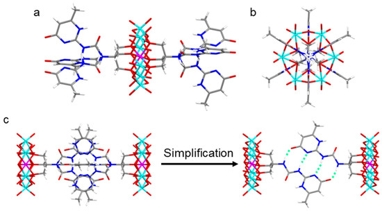 Wireframes of polyanion in crystal 1 from (a) the side view, and (b) the front view. (c) A simplified expression of quadruple hydrogen bonds between two adjacent polyanions in crystal 1, and the organic group attaching on the other side of the cluster is omitted for clarity. Color code: pink for Mn, cyan for Mo, red for O, blue for N, gray for C, and white for H. The green dot lines in Figure 2c refer to the hydrogen bonds.