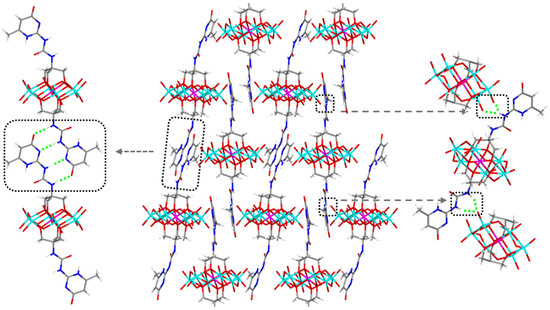 One-dimensional quadruple hydrogen bonding structure in crystal 2. Color code: pink for Mn, cyan for Mo, yellow for Na, red for O, blue for N, gray for C, and white for H. The green dot lines refer to the hydrogen bonds.