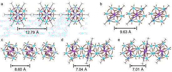 The longitudinal distance between adjacent clusters of crystal (a) 1, (b) 2, (c) 3, (d) 4, and (e) 5 modulated by the organic cations with different sizes. Color code: pink for Mn, cyan for Mo, red for O, blue for N, gray for C, and white for H.