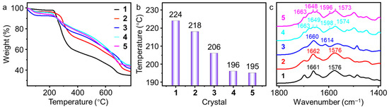 (a) TGA curves of crystals 1–5 and (b) the column diagram of their decomposition temperatures. (c) FT-IR spectra of crystals 1–5, showing the different combination models.