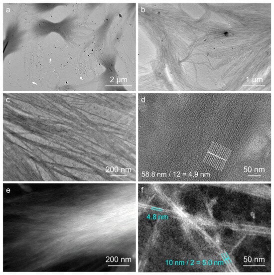 (a–d) TEM images of fibrous assemblies of Na-UPy-MnMo6 with different magnifications. (e,f) HAADF-TEM images of fibrous assemblies of Na-UPy-MnMo6. White arrows refer single fibers.