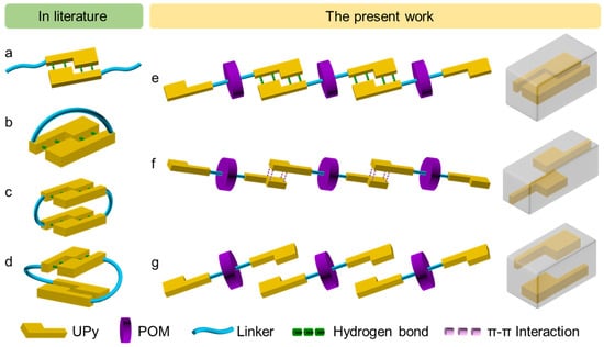 Ureidopyrimidone (UPy), as a typical group in which hydrogen bond donors and acceptors coexist, can form a quadruple hydrogen bonding structure through the combination of two components, thereby being used to construct stable supramolecular assemblies [8]. In the typical UPy-containing supramolecular crystals, when UPy connects to the molecule in a single-headed modification, it often forms a dimer through the quadruple hydrogen bonding between the two molecules (Scheme 1a) [9,10,11,12]. When UPy is connected to both ends of one molecule with double-headed modification, it often self-polymerizes in the form of a circular dimer (Scheme 1b) or binds in a two-molecule [2 + 2] mode with syn (Scheme 1c) or anti (Scheme 1d) conformation [13,14,15,16]. Although the UPy two-headed structure has the possibility of forming a one-dimensional (1D) chain structure through quadruple hydrogen bonding, the intermediate linking group is generally a flexible organic component, and in the reported crystals, they all dimerize in different forms. By changing the linker from a flexible organic unit to a more rigid inorganic component, it is expected to suppress the formation of dimers and obtain a 1D linear structure. In addition, different from the neutral organic linkers in most cases, the charges of the inorganic linkers are adjustable, which introduces the counter ions into the system, increasing variables for the modulation of the structures.