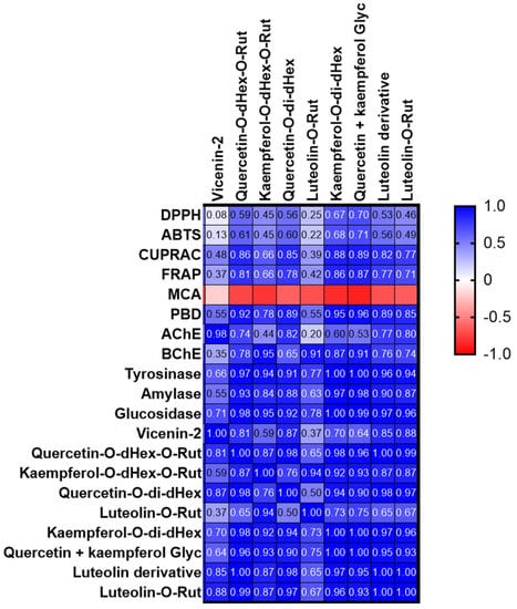 Pearson’s correlation between quantified compounds and antioxidant/enzyme inhibitory assays (MCA: metal chelating assay; PBD: phosphomolybdenum assay).