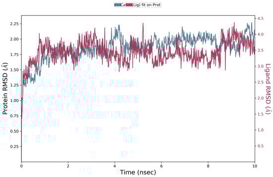 RMSD graphic of Cα of tyrosinase (blue) and quercitrin (Red) over a molecular dynamic simulation of 10 ns of tyrosinase docked to quercitrin.