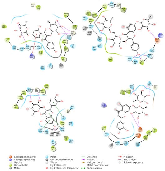 Best docking poses obtained for kaempferitrin (21) (upper left), kaempferol 3-rutinoside 7-rhamnoside (17) (upper right), quercetin 3-rhamnoside (quercitrin) (23) (down left), and luteolin 7-rutinoside (20) (down right) docked to tyrosinase.