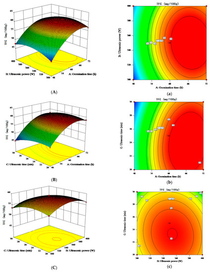 Response surface and contour maps of the interactions between two factors on TFC. (A,a) germination time and ultrasound power; (B,b) germination time and ultrasound time; (C,c) ultrasound power and ultrasound time.
