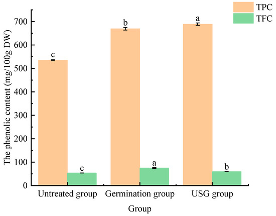 The response surface test plots and contour plots for different factors on TPC and TFC are shown in Figure 1 and Figure 2. As shown in Figure 1, the contour lines of the interactions are all circular and these are not significant. As shown in Figure 2, the contours lines of the interaction terms X1X3 and X1X2 are elliptical and there is a maxima for each response value. When ultrasonic pretreatment power was 356.57 W for 24.45 min, and germination time was 64.11 h, the predicted value of TPC was 686.30 mg/100 g. When ultrasonic pretreatment power was 351.11 W for 23.97 min, and germination time was 66.58 h, the predicted value of TFC was 60.38 mg/100 g. The predicted values were validated based on the optimal process parameters to examine the reliability of these results. However, considering the limitation of the instrument and energy consumption, the optimal process parameters were adjusted to 64 h germination time, 350 W ultrasound power, and 25 min ultrasound time. Three parallel tests were conducted under these conditions. The average TPC and TFC of the USG sample were 688.84 ± 5.30 mg/100 g and 59.23 ± 0.45 mg/100 g, respectively, which were significantly higher than those in the untreated sample (535.84 mg/100 g and 53.77 mg/100 g, respectively). In addition, USG treatment was able to significantly increase the TPC compared to the germination treatment (Figure 3). The actual values of TPC and TFC obtained from parallel tests conducted under the optimal conditions predicted using the regression model were close to those predicted by the model. Therefore, the obtained regression model indicates the feasibility of process optimization and may have implications for its utility.