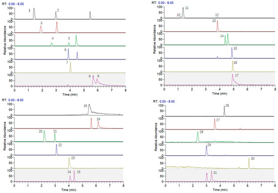 Extraction ion current chromatogram for 31 phenolic compound standard samples. 1: homogentisic acid; 2: vanillic acid; 3: protocatechuic acid; 4: p-hydroxybenzoic acid; 5: sesamol; 6: p-coumaric acid; 7: ferulic acid; 8: kaempferol; 9: luteolin; 10: phlorogucinol; 11: pyrogallol; 12: maltol; 13: taxifolin; 14: rutin; 15: diosmin; 16: kaempferol-3-O-rutinoside; 17: myricetin; 18: quercetin; 19: diosmetin; 20: catechin; 21: epicatechin; 22: puerarin; 23: homoorientin; 24: vitexin; 25: isovitexin; 26: naringin; 27: procyanidine A2; 28: procyanidine B2; 29: 4-hydroxybenzaldehyde; 30: 6-gingerol; 31: vanillin.