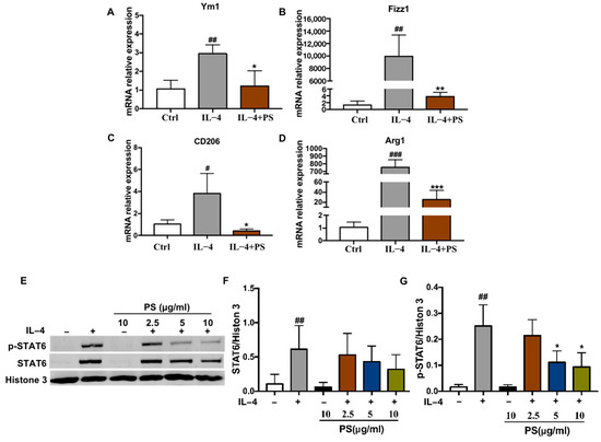 To investigate whether PS may alter macrophage polarization, we utilized an M2 macrophage activation experiment by IL-4 stimulation in vitro. Bone marrow-derived macrophages (BMDMs) from C57Bl/6 mice were pre-treated with PS (2.5, 5, 10 μg/mL) or a vehicle for 12 h, and then stimulated with IL-4 (25 ng/mL) for 6 h, and all cells were collected after treatment for qPCR. As shown in Figure 1A–D, the levels of M2 macrophage marker genes Arg1, Fizz1, Ym1, and CD206 mRNA were significantly increased after IL-4 stimulation in BMDM, suggesting Il-4 could induce macrophage M2 polarization. PS substantially down-regulated Arg1, Fizz1, Ym1, and CD206 mRNA levels, compared to IL-4 stimulation alone, indicating that PS can inhibit M2 macrophage polarization. Published data have shown that cytokines such as IL-4 activate STAT6, and phosphorylated STAT6 translocates to the nucleus, and promotes transcription of M2 macrophage marker genes. Therefore, we further investigated the protein level of phosphor-STAT6 in nuclei. Except for the Ctrl group, BMDMs were pre-treated with PS (2.5, 5, 10 μg/mL) or the vehicle for 6 h, then stimulated with 25 ng/mL IL-4 for 15 min; all cells were collected after treatment for a Western blot analysis. As shown in Figure 1E–G, the level of STAT6 and phosphor-STAT6 was significantly increased in nuclei after IL-4 stimulation, and PS substantially decreased the phosphor-STAT6 level, not the STAT6 level. PS did not affect BMDMs without IL-4 stimulation (Figure 1E, lane 3). Taken together, these results suggest PS can inhibit M2 polarization, and attenuate STAT6 phosphorylation and translocation in BMDMs.