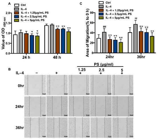 As we all know, M2-polarized macrophages can promote tumor cell proliferation and migration through paracrine effects [27]. To examine whether PS affects the proliferation and migration of tumor cells by inhibiting macrophage polarization, a conditioned medium (CM) was collected from IL-4-stimulated BMDMs pretreated with the vehicle (IL-4-CM) or PS (IL-4+PS-CM), and CM from common culture BMDMS without IL-4 or PS treatment acted as the control (Ctrl-CM). Cell proliferation of B16-F0 was tested by MTT, after being treated with different CM for 24 and 48 h. As a result, as is shown in Figure 2A, compared with Ctrl-CM, IL-4-CM had no effect on B16-F0 proliferation, but IL-4+PS-CM significantly inhibited B16-F0 proliferation compared with IL-4-CM (Figure 2A). Cell migration is a crucial event in many biological processes, including cancer progression, tissue formation, and immune defense [28]. The wound-healing assay is a common method to observe the migration ability of cancer cells [29]. The results of the wound healing experiment showed that, compared to Ctrl-CM, IL-4-CM significantly promoted the migration of B16-F0 cells. Furthermore, IL-4+PS-CM notably inhibited B16-F0 migration compared with IL-4-CM from IL-4 (Figure 2B,C). These results indicated that PS inhibited B16-F0 cell proliferation and migration, which was related to its effect on inhibiting M2 polarization.