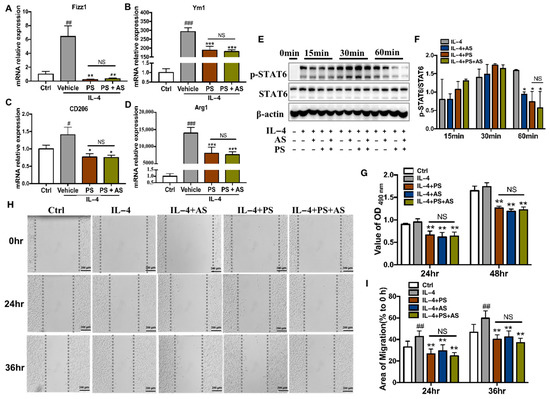 To prove this, the target gene or protein was usually interrupted by an inhibitor/agonist, or knockdown/over-expressing [50,51]. AS, a STAT6-specific inhibitor, inhibits IL-4-induced STAT6 activation in vitro and in vivo, thereby attenuating macrophage M2 polarization [52,53] and number [54]. AS was demonstrated by a decrease in Arg1, Fizz1, Ym1, and CD206 [55], which can attenuate the progression of tumors in vitro and in vivo. It has been reported that AS can inhibit tumor growth and early liver metastasis in a 4T1 mammary carcinoma mouse model by inhibiting TAM-induced pro-tumorigenic and pro-metastatic activities via STAT6 [48]. In this study, our results also showed that AS reduced STAT6 activity (Figure 3E) and suppressed B16-F0 cell proliferation (Figure 3G) and migration (Figure 3H,I). Furthermore, PS and AS had a similar effect on inhibiting STAT6 activation, as well as M2 polarization and B16-F0 cell proliferation and migration. Importantly, we found that, compared with PS alone, the combination of PS and AS did not have an additional effect (Figure 3). Since AS is a STAT6-specific inhibitor, when STAT6 has been blocked, PS will not work if it targets STAT6. These results showed that PS+AS could not further reduce the level of phosphor-STAT6, indicating that PS acts at the same target as AS. These data indicated that the inhibiting effects of PS on M2 macrophage polarization depended on the STAT6 signaling pathway.