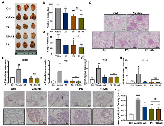 To examine whether PS can inhibit the development of tumors by inhibiting the polarization of M2 macrophages in vivo, we injected B16-F0 cells into C57BL/6 mice via the tail vein to establish a lung metastasis animal model. Tumor-bearing mice were treated with the vehicle, PS, AS, or PS+AS, respectively. During the entire experiment period, mice had a normal weight-increasing tendency, and there was no significant difference in the body weight of the mice in each group (Figure S2). Lung metastasis points in the PS- and AS-treated groups were significantly reduced compared with those in the vehicle-treated groups, and there was no significant difference between the PS and AS groups. There was no additive effect in the PA+AS group, compared with the AS or PS treatment (Figure 4A,B). A lung metastasis foci calculation by histopathology examination after H&E staining also confirmed these findings (Figure 4C,D). These results indicate that AS, PS, and PS+AS can effectively inhibit tumor progression in vivo, and no significant difference in tumor inhibition was observed among PS or AS alone and PS+AS in combination. This suggests that PS and AS may inhibit tumor progression through the same target, which further indicates that the tumor-inhibitory effect of PS in vivo may be due to the inhibition action of STAT6 signaling. To examine whether PS suppresses TAM polarization in vivo, the tumor-bearing lung tissue from each treatment group was freshly isolated. The RT-PCR analysis showed that PS or AS treatment significantly down-regulated M2 macrophage-specific genes Arg1, Fizz1, Ym1, and CD206 expression compared with the vehicle group (Figure 4E–H), suggesting PS inhibits alternative TAM activation (M2) in vivo. There was no difference among the AS, PS, and PS+AS treatment groups. Furthermore, the immunohistochemistry of lung tissue for CD206 showed that PS significantly suppressed CD206 expression (Figure 4I,J). Taken together, these data indicated that PS inhibited M2 polarization and attenuated B16-F0 melanoma lung metastasis in a STAT6-dependent manner.