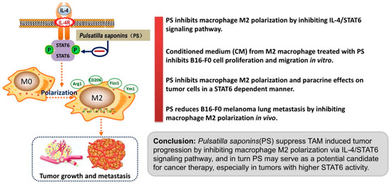 Pulsatilla saponins (PS) are the saponin fraction of extracts from Pulsatilla chinensis (Bge.) Regel, a traditional Chinese medicine known for its significant anti-inflammatory effects. Studies from our team have shown that PS inhibited tumor growth by promoting tumor cell apoptosis, inhibiting cell proliferation, and disturbing tumor energy metabolism in vivo and in vitro [22,23]. Several effective anti-tumor constituents have been identified from the PS fraction, such as Pulsatilla saponin D (PSD), Raddeanoside R13 (R13), and Pulsatilla saponin A (PSA), etc. Our previous study revealed that a combination of PSD, R13, and PSA had a synergetic effect in inducing tumor cell apoptosis [24]. The same effect has been shown in hepatoma H22-bearing mice. The tumor inhibition rate of Pulsatilla saponins was 71.3%, but the inhibition rates of PSD, R13, and PSA were 57.7%, 62.1%, and 49.2%, respectively. These results suggest that PS is more effective in inhibiting tumors in vivo [25,26], but the mechanism is unclear. The present study demonstrates that PS inhibited B16-F0 melanoma growth and metastasis by attenuating M2 macrophage polarization via the STAT6 signaling pathway.