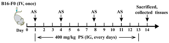 The mouse lung metastasis model was established as described previously [56], and 2.5 × 105 B16-F0 melanoma cells were injected into C57BL/6 mice intravenously via the tail vein. All tumor-bearing mice were divided into four groups (14 mice for each group): vehicle (treated with saline by intragastric administration), STAT6-specific inhibitor AS1517499 (MCE) (treated with AS by intraperitoneal injection twice a week at 5 mg/kg dose), PS (treated with PS by intragastric administration at 400 mg/kg once a day for 13 days) [23,25], and AS+PS (treated with AS and PS using the same dose and times with a single treatment group). All treatments were started on day 2 of the B16-F0 cell injection. The other 10 normal mice (who only received saline injections or intragastric administration) were set as the control group. Two weeks after B16-F0 cell injection, mice were sacrificed, and the lung metastasis of tumor cells was determined by quantifying the melanoma nodules in the perfused lung from 8 mice in each group. Lung tissues from the other 6 mice in each group were removed and immediately snap-frozen in liquid nitrogen for RNA or protein isolation. The experimental procedure is shown in Figure 6.