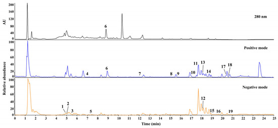 Qualitative analysis was performed to identify the chemical compounds in ORS; to this end, UHPLC-Q-Orbitrap-MS was used. The chemical compounds in ORS were identified by comparing the retention times and mass spectra of the reference standard compounds, and 19 compounds were identified. The base peak chromatograms of the ORS in both positive and negative ion modes are shown in Figure 1, and detailed information regarding the identified compounds is listed in Table 1. Injection peak was found around 1.5 min, and this peak may be composed of the various eluents of sugars, amino acids, and so on (Figure 1). The apparent peak at 10.4 min, which were only found in UV chromatogram, was not sufficient to identify a certain phytochemical with low intensity and less MS2 fragmentation pattern (Figure 1, upper panel). In this regard, the quantitative analysis of ORS was performed except for the above-mentioned peaks.