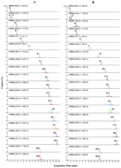 The UPLC-TQ-MS/MS method (in the MRM mode) was used to quantify the compounds in ORS, and 19 compounds were simultaneously detected within 20 min. The MRM mode allows for highly specific and sensitive analyses [34]. A single standard solution of each analyte was injected to investigate the ion pairs (consisting of precursor and product ions in both positive and negative ion modes). Atractyloside A was determined in the negative ion mode, and all remaining compounds were determined in the positive ion mode. For all analytes (including the internal standard, IS), the MRM parameters (including the selected MRM pairs and collision energies) were optimized (the details are listed in Table 2). The chromatograms of the 19 compounds and IS, as obtained in the MRM mode, are shown in Figure 2.