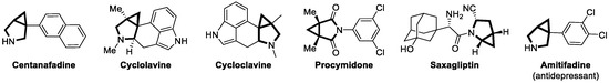 - Časar, Z. Synthetic Approaches to Contemporary Drugs that Contain the Cyclopropyl Moiety. Synthesis 2020, 52, 1315–1345. [Google Scholar] [CrossRef]