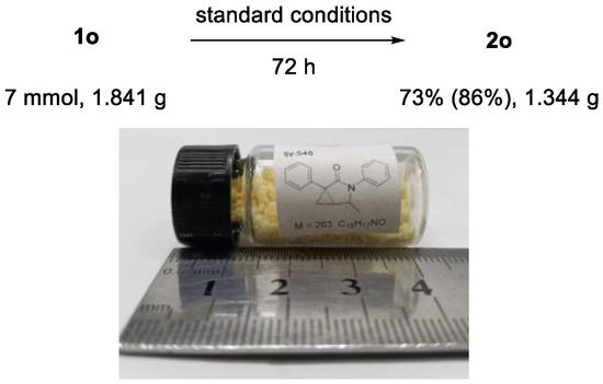 With the aim of devising a practical, gram-scale synthesis of a biovaluable aza[3.1.0]bicycle scaffold, a reaction on 7 mmol (1.841 g) was carried out with this improved synthetic method based on the base-promoted intramolecular addition of alkenes. When we treated 1o under optimal conditions, the reaction smoothly furnished a 73% yield of 2o after 72 h under standard conditions, with 17% 1o recovered (86% yield of 2o based on the conversion of the substrate) (Scheme 4).