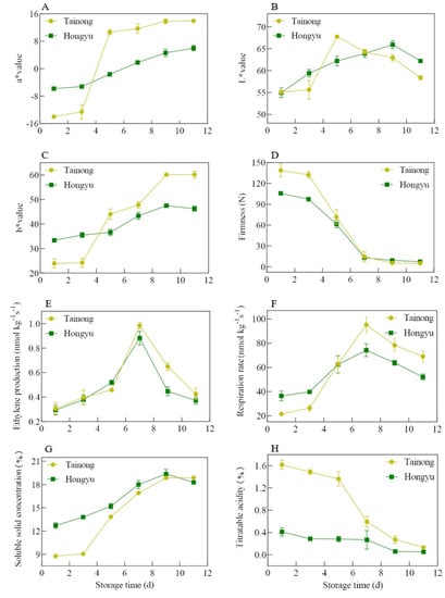 Difference of a* value (A), L* value (B), b* value (C), firmness (D), ethylene production (E), respiration rate (F), soluble solid concentration (G), and titratable acidity (H) between ‘Tainong’ and ‘Hongyu’. Error bars represent the standard deviation of means.