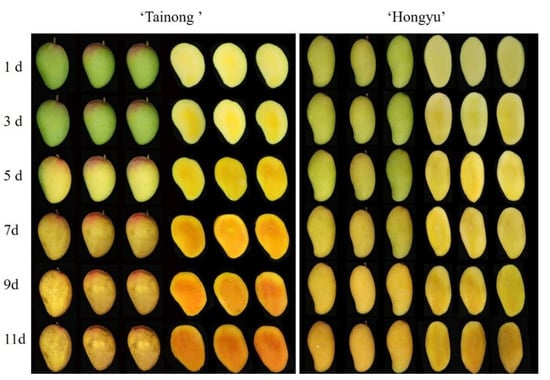 Mango (Mangifera indica L.) is one of the most consumed and commercially significant tropical fruits, with more than 26 million tonnes produced annually worldwide [1]. ‘Tainong’ and ‘Hongyu’ are the main commercial mango cultivars produced in Changjiang County, Hainan Province, China. Mangoes are suitable for long cultivation in slightly acidic soils, or sandy loamy soils; they are not cold-tolerant and need to be cultivated at temperatures above 15 °C [2]. Mangoes are prone to browning of the flesh, degradation of texture, or changes in flavour during post-harvest ripening, shipping, and storage, resulting in the disposal of large quantities of substandard fruit each year [2,3,4].