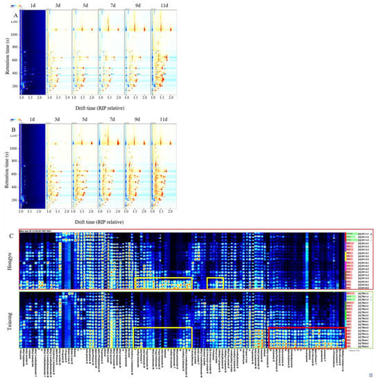 The topographic plots of GC–IMS spectra of ‘Hongyu’ intact mango (A), and ‘Tainong’ intact mango (B), with different storage time. The gallery plot (C) of VOCs in intact mangoes with different storage time.