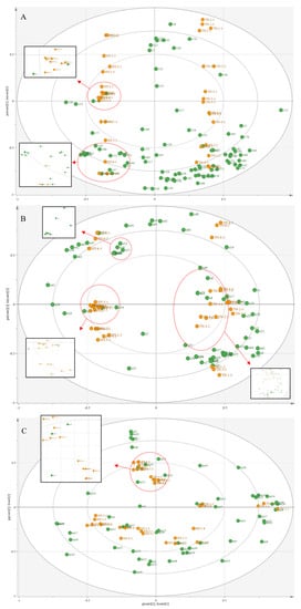 The OPLS-DA model is based on the VOCs of mangoes at different storage periods. (A) Biplot based on GC-IMS intact mango data, numbers “v1”–”v86” are VOCs in Table 2; (B) Biplot based on GC-IMS cut mango data, numbers “s1 “–“s64” for VOCs in Table 2; (C) Biplot of HS-SPME-GC-MS data, numbers “m1”–“m56” are the VOCs in Table 2.