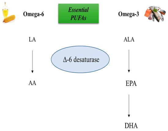 Biosynthesis of N-3 and N-6 PUFAs. The biosynthesis of N-3 and N-6 polyunsaturated fatty acids (PUFAs) involves competition between the N-6 PUFA linoleic acid (LA), and the N-3 PUFA alpha-linolenic acid (ALA), for binding to delta (∆)-6 desaturase. Depending on the amount of dietary intake of PUFAs, one of these metabolic pathways is activated. If the intake of N-6 PUFAs is higher than N-3 PUFAs, the metabolic pathway leads to the synthesis of arachidonic acid (AA). On the other hand, if the intake of N-3 PUFAs is higher than N-6 PUFAs, the metabolic pathway leads to the synthesis of eicosapentaenoic acid (EPA) and docosapentaenoic acid (DHA).