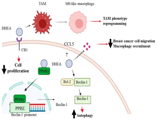 Mechanism of action and biological effects of DHEA in breast cancer. Docosahexaenoyl ethanolamide (DHEA) can increase Beclin-1 expression through the peroxisome proliferator-activated receptor (PPAR) γ binding to its response element (PPRE) in the promoter region of Beclin-1 and increase its dissociation from the Beclin-1/Bcl2 complex, inducing autophagy. DHEA can also bind to cannabinoid receptor 1 (CB1), which partially mediates its antiproliferative and antitumoral effects in breast cancer cells. DHEA can also modify the secretion of the C-C motif chemokine ligand 5 (CCL5), reducing breast cancer cell migration and macrophage recruitment. Furthermore, DHEA can affect the inflammatory tumor microenvironment, affecting tumor-associated macrophage (TAM) markers’ expression, and reprogramming the TAM phenotype. Created with BioRender.com.