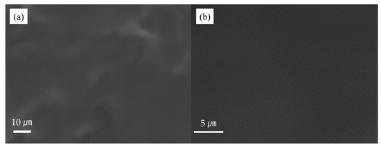 Scanning-electron microscopy (SEM) was used to identify the pores on the film side and the PP side of the HEC/LA/PP composite. As shown in Figure 1a, the entire surface of the film was coated smoothly before the process. At this point, pores had not formed, and the surface was coated smoothly overall. Figure 1b is an enlarged image of Figure 1a. It was confirmed that the numerous round dots on the film surface were evenly spread over the LA plasticized portion.