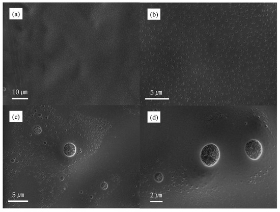 Figure 3a–d are images of the HEC/LA/PP membrane’s surface after the vacuum-assisted method was applied. On the surface of the HEC/LA/PP membrane after process, small pores were uniformly formed, as shown in Figure 3a,b. These were distinctly different from those on the surface of the membrane in Figure 1a,b. Furthermore, as shown in Figure 3c,d, large pores partially formed, and the HEC region did not collapse and maintained its morphology, despite the pore formation. Examining the data in Table 1 and the presence or absence of pores in the surface of the membrane, it was confirmed that the pores of the membrane and the pores of the PP were connected, allowing the ethanol to pass through. Furthermore, it was demonstrated that the LA was dispersed well in the HEC, as shown in Figure 1a,b.