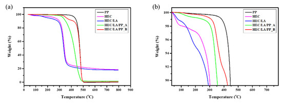 (a) TGA data of PP, HEC, and HEC/LA, and (b) enlargement of (a). HEC/LA/PP_A = before vacuum-assisted process, and HEC/LA/PP_B = after vacuum-assisted process.
