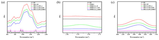 FT-IR: deconvoluted FT-IR of ether groups of (a) neat HEC/PP, (b) HEC/LA/PP_A, and (c) HEC/LA/PP_B.