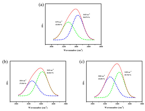 FT-IR: Deconvoluted FT-IR of hydroxy group of (a) neat HEC/PP, (b) HEC/LA/PP_A, and (c) HEC/LA/PP_B.