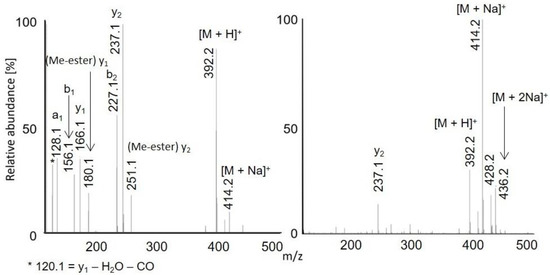 Protonated molecules and sodium adducts of acetylated peptides and selected methyl esters of acetylated peptides were fragmented with CID in an ion trap. The fragmentation spectra of acetylated LAF, AWSVAF, and VLASSAE are shown in Figure 4, Figure 5 and Figure 6; mass spectra of other acetylated peptides are reported in the Supplementary Materials (Figures S2, S3, S5, S7, S8, S10, S12, S14, S16, and S18). Full scan and CID spectra were somewhat similar. Some fragments in the full scan spectra could be related to the thermal decomposition of the peptides.
