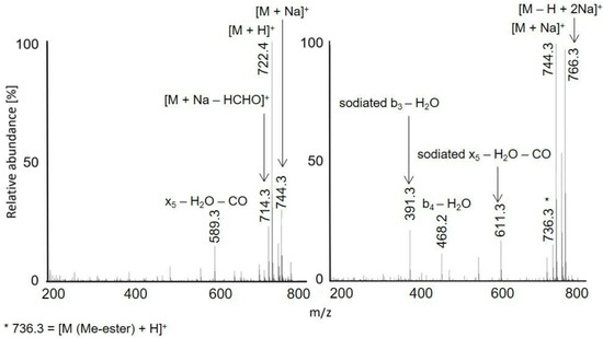 The methyl esters of acetylated SLGE and VASLF showed a similar behavior as nonmethylated acetylated peptides, providing abundant a, b, and y ions in MS2 (Figures S3 and S8). Abundant molecular and fragment ions corresponding to neutral losses of water and HCHO were observed.
