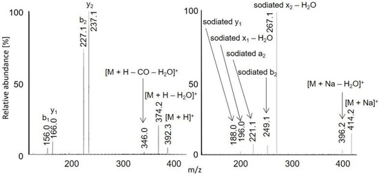 MS2 spectra of acetylated LAF: [M + H]+ m/z 392.2 in APCI (left) and [M + Na]+ m/z 414.2 in APPI (right).