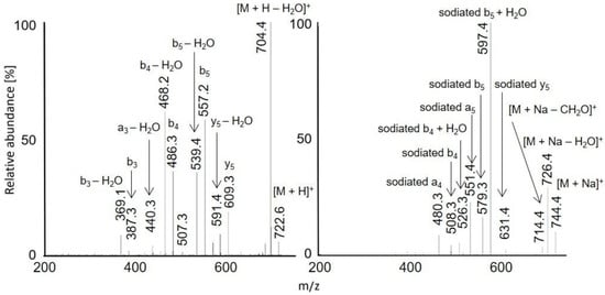 MS2 spectra of acetylated AWSVAF: [M + H]+ m/z 722.6 in APCI (left) and [M + Na]+ m/z 744.4 in APPI (right).
