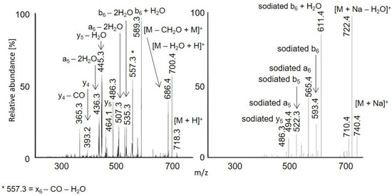 MS2 spectra of acetylated VLASSAE: [M + H]+ m/z 718.3 in APCI (left) and [M + Na]+ m/z 740.4 in APPI (right). The peak marked with an asterisk is m/z 557.3, x6 – CO − H2O.