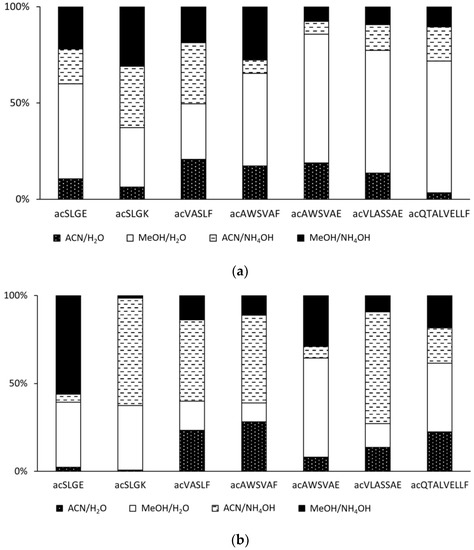 The mobile phases for separating peptides usually contain acetonitrile or methanol and an aqueous buffer solution. In addition to providing separation, the mobile phase must also effectively support the ionization of the analytes. As regards gas-phase ionization methods, i.e., APCI and APPI, we have previously shown that ionization of peptides is most efficient when no buffer is present and the mobile phase is neutral or basic [39]. Here we tested the signals of acetylated SLGE, SLGK, VASLF, AWSVAF, AWSVAE, VLASSAE, and QTALVELLF in acetonitrile and methanol combined with water or aqueous ammonium hydroxide (pH 9). The organic and aqueous phase ratio was 4:1 (v/v). The relative intensities of peptide signals varied; however, all mobile phase combinations proved efficient for gas-phase ionization (Figure 7). In APCI, five out of seven tested peptides provided significantly higher signals in the aqueous mobile phases with no pH adjustment. In APPI, however, most peptides were efficiently ionized in the ammonia-treated mobile phase. The difference between methanol and acetonitrile can be related to the proton affinities of these solvents and the analyzed peptides. Methanol has lower PA than acetonitrile [73], facilitating efficient ionization of peptides with a relatively low PA.