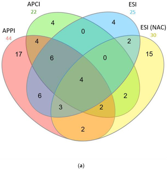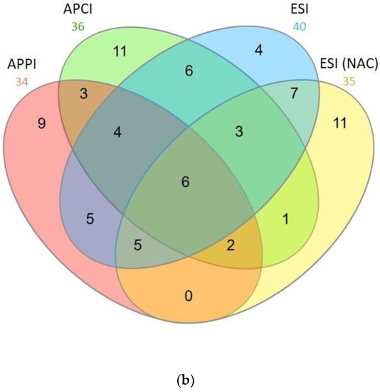 The mass spectrometer was operated in the positive ion mode. In ESI, the ion source parameters were as follows: sheath and auxiliary gases were 35 and 5 arbitrary units, respectively; the source voltage was 4.80 kV; the capillary voltage was 7.0 V; the tube lens offset was 100.0 V; and the capillary temperature was 250 °C. In APCI, sheath and auxiliary gases were set at 50 and 10 arbitrary units, respectively; probe temperature was 480 °C; the corona discharge current was 10.00 µA; the, tube lens offset was 110.0 V; and the capillary temperature was 275 °C. In APPI, a krypton lamp from Syagen Technology, Inc. (Tustin, CA, USA) that emits photons at 10.0 eV and 10.6 eV (123.6 nm and 118.0 nm) was used. The sheath and auxiliary gases were at 90 and 10 arbitrary units, respectively; the probe temperature was 480 °C; the tube lens offset was 160 V; and the capillary temperature was 275 °C.