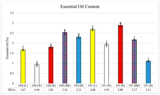 Variation of essential oil content in Origanum majorana (OM) and O. vulgare (OV) species grown under different light spectra: C—ambient natural light, B—blue LED, R—red LED, BR—7:3 mix of blue and red LED, W—white LED. The letters on the graph illustrates the mean differences of studied samples in different LED treatments.